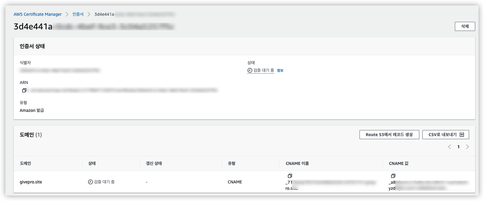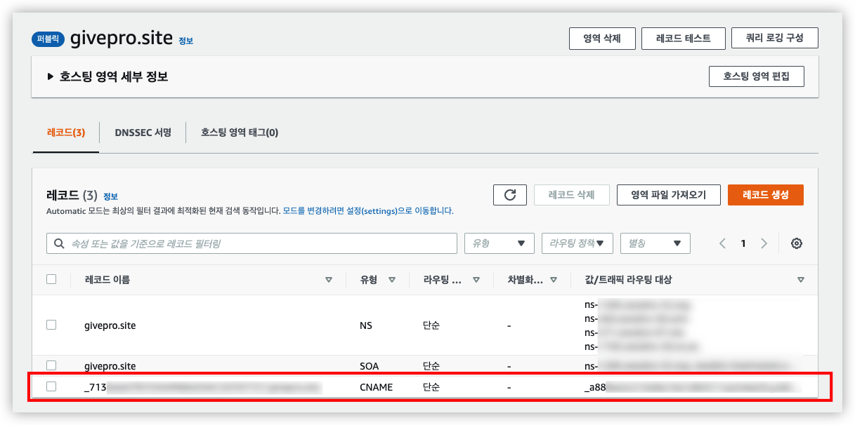 그러면 CNAME 이름과 값이 생성이 되는데요. 이 값은 지우면 안됩니다. (SSL 인증을 위한 CNAME)